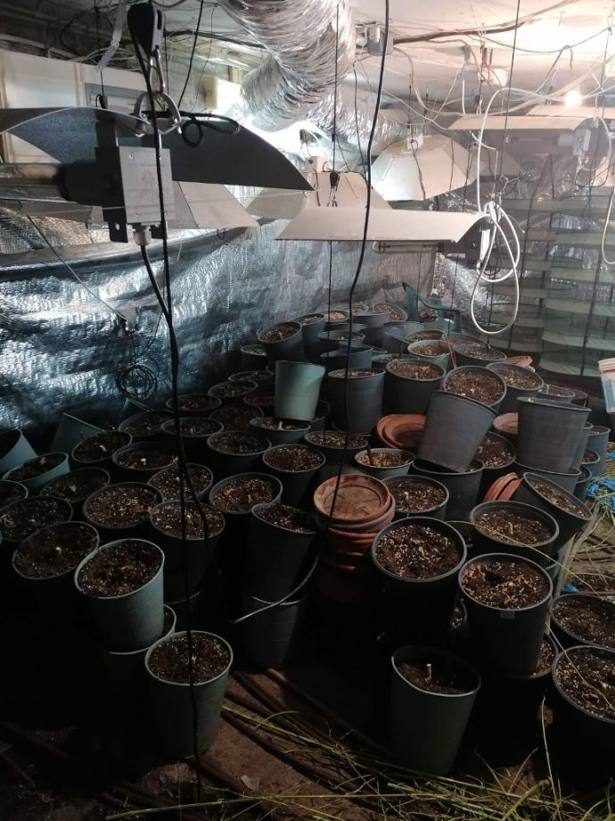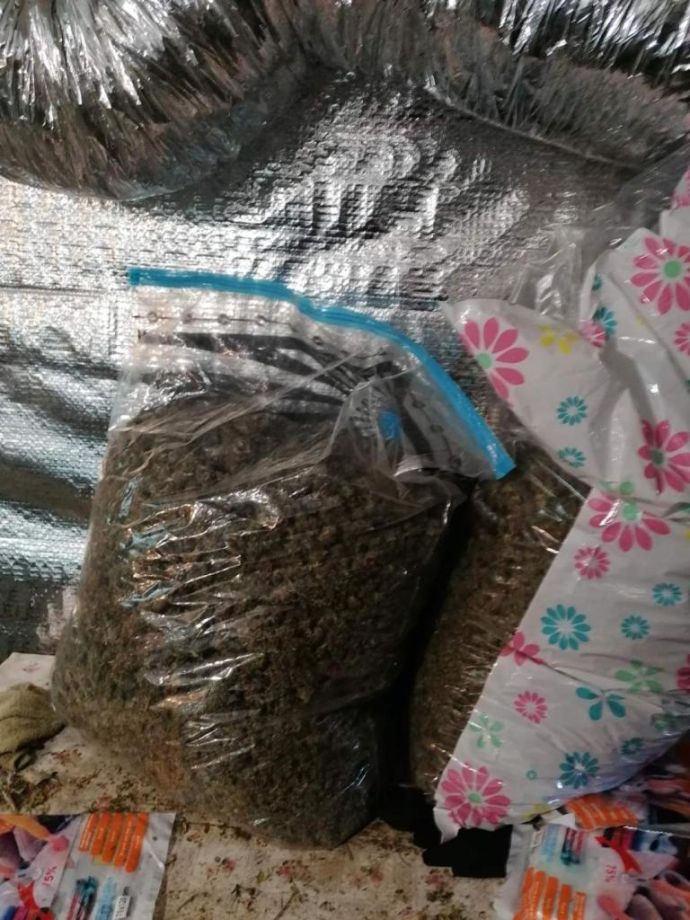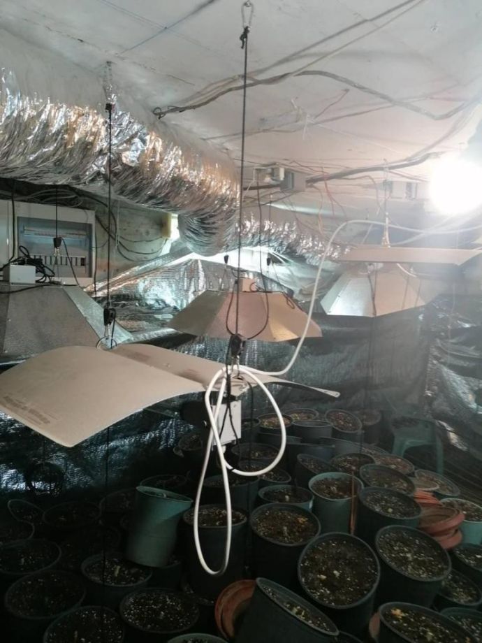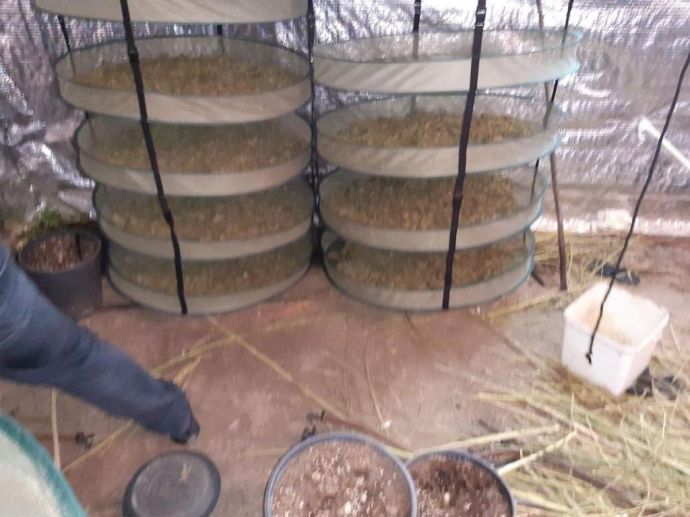 В мазето на къщата, пригодено и оборудвано за оранжерия за отглеждане на марихуана, са намерени и иззети 270 саксии с част от стеблата на конопени растения, мелачка съдържаща суха зелена тревна маса, 17 кварцови лампи с адаптори, вентилатори, течни торови препарати, електронна везна, пет сушилника съдържащи суха зелена тревна маса и два чувала със суха зелена тревна маса / общото тегло на намерената марихуана е около 20 кг./![]()