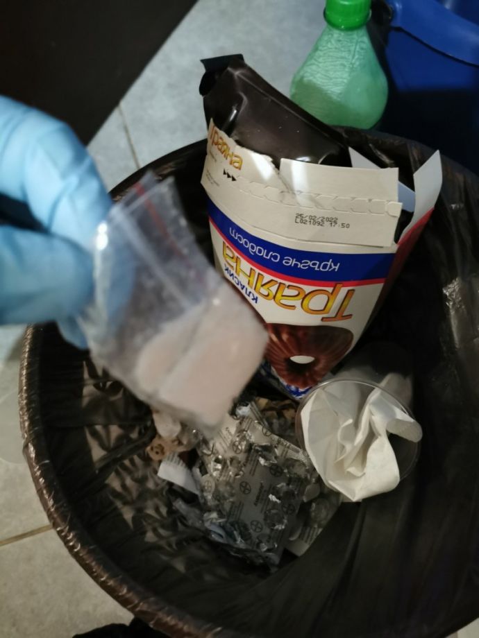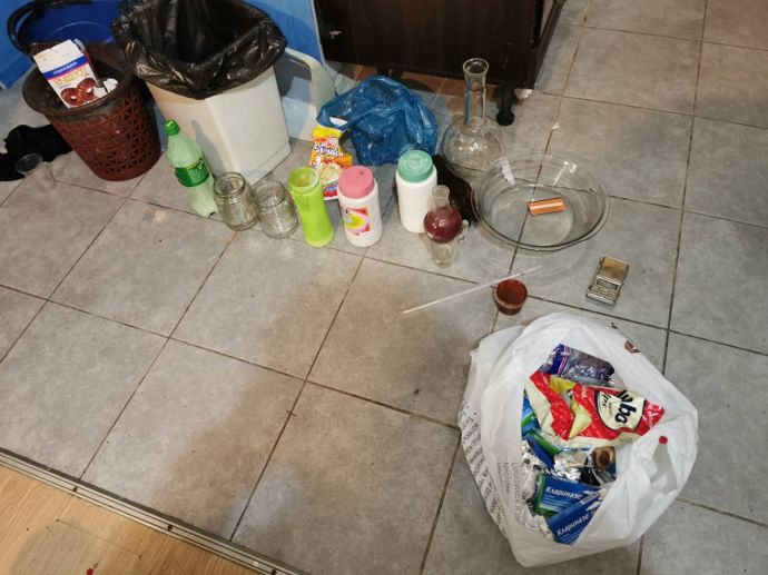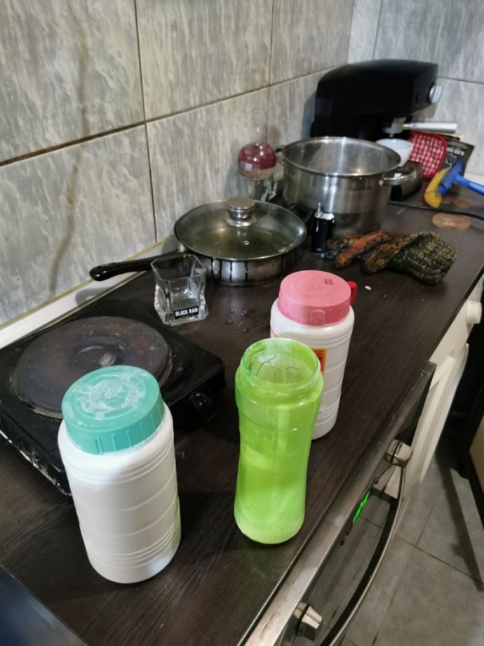 При претърсване със съдействието на служители от сектор „Специализирани полицейски сили” към ОДМВР – Бургас и Четвърто Районно управление - Бургас, станало около 02.00 ч. на 15-и април са намерени и иззети: множество пособия и прекурсори за производството на високорисковото наркотично вещество ,,метамфетамин‘‘. Иззети са стъклени колби заедно с червеникаво прахообразно вещество, стъклена купа, шишета с гъста бяла течност, солна киселина, множество шишета с разредител, специализиран термометър, йод на кристали, червено на цвят прахообразно вещество / фосфор/, електронна везна, плик с кристалообразно вещество / метамфетамин/ и др.![]()