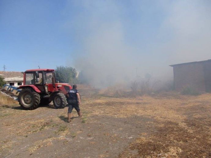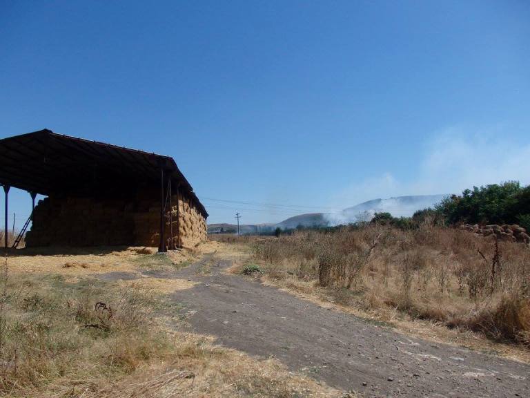 Огромен пожар бушува зад Професионалната гимназия по селско стопанство в Карнобат, в близост до кравеферма, както и до двора на Института по земеделие.