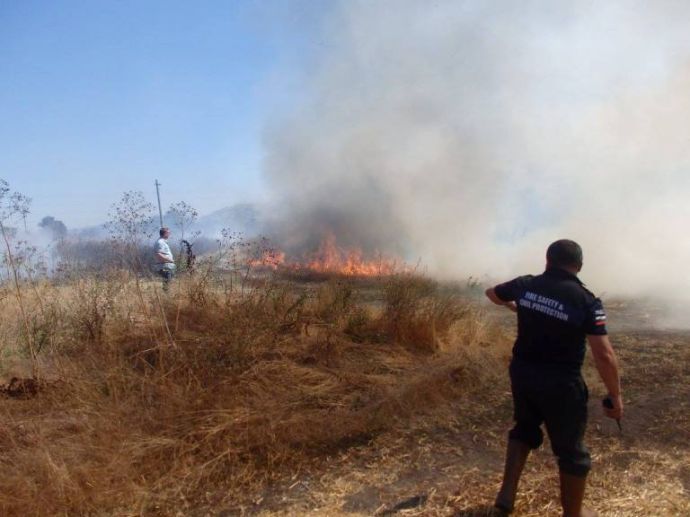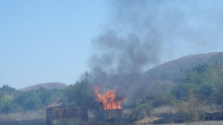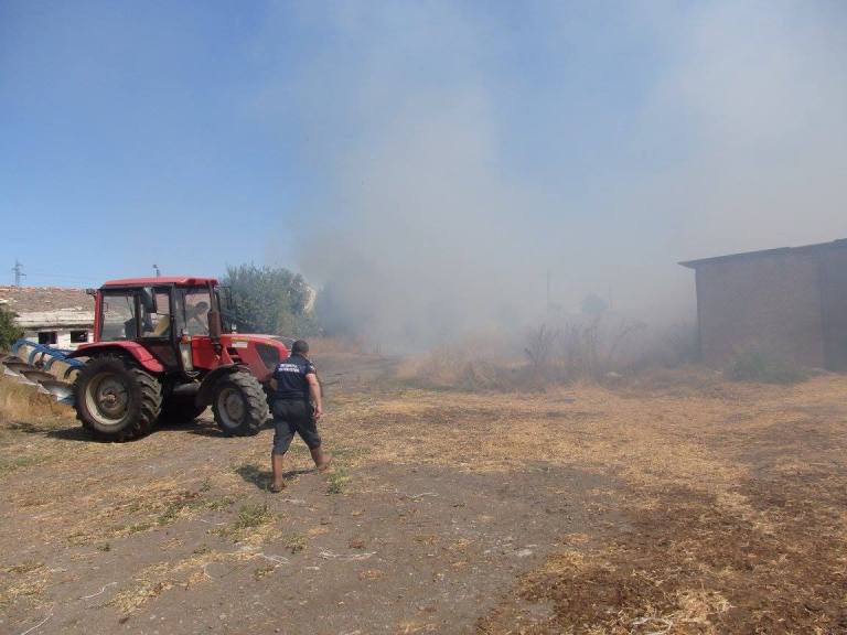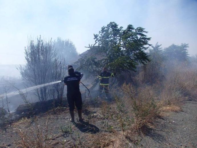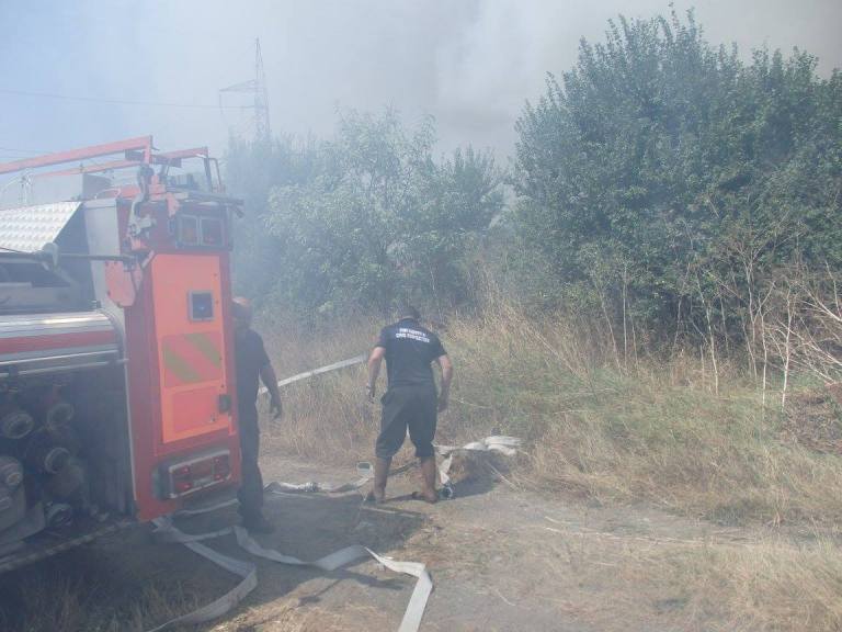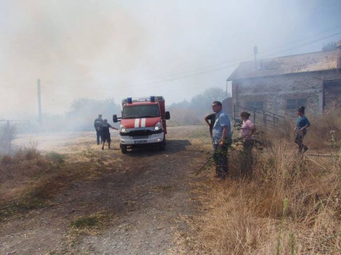 Той добави, че вече е ликвидирана опасността огънят да обхване намиращите се в близост сгради, но все още пожарът не е в овладян. За момента горят сухи треви и храсти, в близост има и залесена с дървета площ.