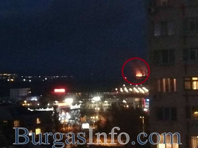 Пожар избухна край пътя за Сарафово, като пламъците се издигат високо в небето. Огънят се виждат от километри, а кълбета дим се стелят във въздуха