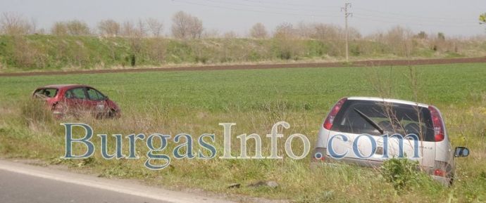 Два леки автомобила – "Опел" и "Рено" се метнаха в нивата край пътя от Бургас към квартал "Ветрен". По първоначална информация единият от автомобилите е застигнал първия и го е блъснал, следствие на което и двете коли са излетели от шосето.