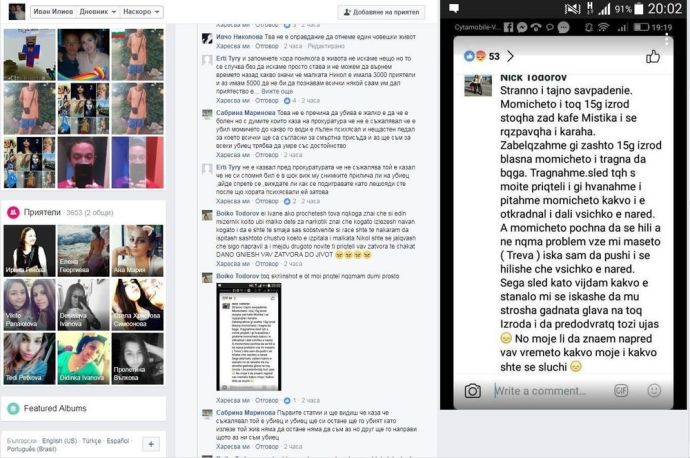 Интересен факт е, че часове след убийството младежът следи и качва статии за престъплението, макар че тогава все още името на мъртвото момиче не бе оповестено. В момента в профила на Иван валят закани и упреци. В един от коментарите потребител споделя скрийншот от свой приятел. Според текста в него, последният видял двете деца да стоят зад кафе „Мистика”. Момчето блъснало Никол и тръгнало да бяга. Те ги настигнали, за да помогнат на момичето и питали какво има, а тя се усмихнала и обяснила, че не било нищо сериозно. Скарването било, защото той й откраднал масето (тревата), защото искал да пуши сам.