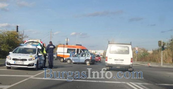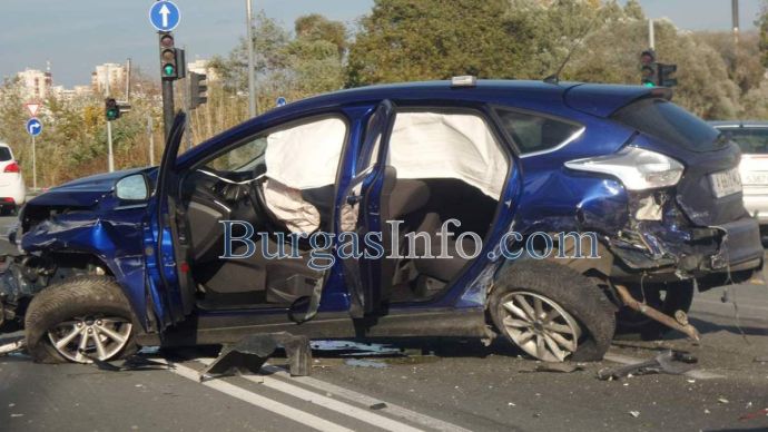 Няма пострадали при жестоката катастрофа на бул. „Тодор Александров” и ул. „Спортна” в Бургас. От инцидента две коли бяха буквално помлени, а като причина за удара от полицията посочват преминаване на червен светофар.