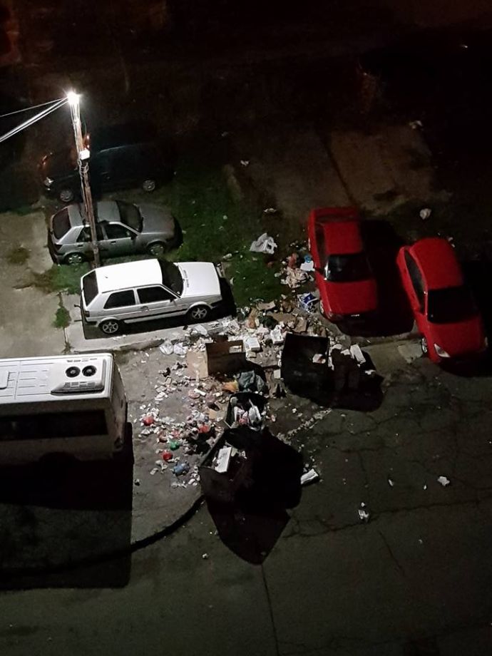 "Голямо ровене е паднало май" и "Някой си търси златото", са част от коментарите във фейсбук. Съдържанието на кофите е буквално пресято и всичко, което е било в тях, е разпиляно навън, в близост до паркираните автомобили.