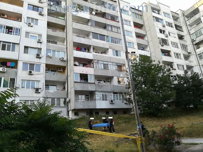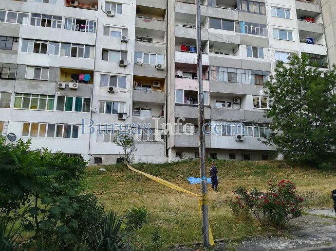 Мъжът е облечен със светла тениска и къси панталонки. Тялото му останал на поляната пред блока около час и половина след инцидента, който стана към 18:30ч. Току-що пристигна и трупната линейка, която ще го откара в Бургаската морга. Мястото гъмжи от полиция.