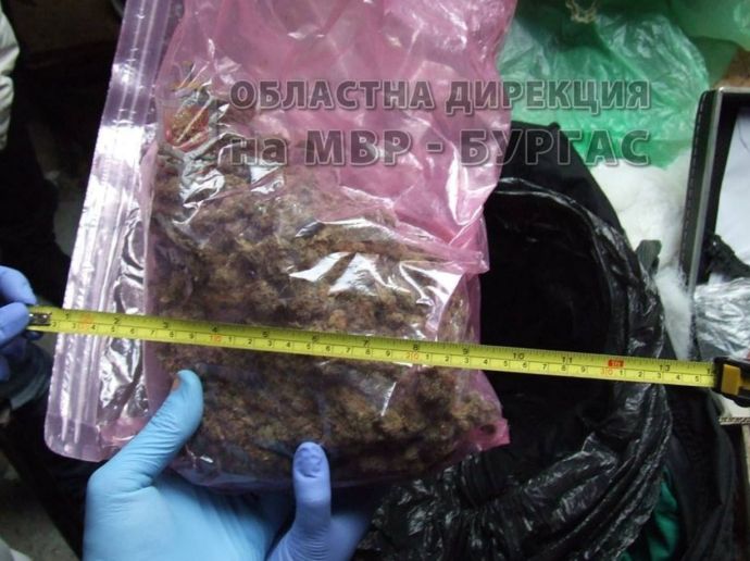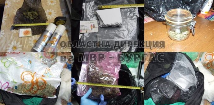 В резултат на съвместните действия на служители от отдел "Криминална полиция" при ОДМВР – Бургас и сектор "Специализирани полицейски сили" при СДВР, на първи километър от автомагистрала "Тракия", в посока от София към Бургас, е спрян лек автомобил "Ауди А 6", с хасковска регистрация, управляван от 40-годишен криминално проявен мъж от Димитровград. В автомобила е намерен и иззет сак, съдържащ 25 пресовани разфасовки от по 200 грама, съдържащи суха зелена листна маса / канабис/ или общо 5 килограма канабис, както и пакет с бяло прахообразно вещество / кокаин/ с тегло от 200 гр. 40-годишният мъж и неговата 25-годишна спътничка, също от Димитровград, са задържани за срок от 24 часа. Впоследствие спремо 40-годишният мъж е взета постоянна мярка "задържане под стража". По случая е образувано досъдебно производство. - служители от Районно управление – Поморие извършили претърсване в дома на 33-годишен помориец, разположен на ул. "Крайбрежна", като намерили и иззели : 650 грама суха тревна маса във вид на глави / канабис/, както и 150 грамова плочка от бяло вещество, реагирала при извършения полеви наркотест на амфетамин. Помориецът е задържан с полицейска заповед за срок от 24 часа. По случая е образувано бързо полицейско производство. - при извършено претърсване в дома на 43-годишна криминално проявена бургазлийка, разположен на бургаската улица "Княз Борис І", служителите от Второ Районно управление – Бургас намерили и иззели торба със зелена суха тревна маса / канабис/ с тегло около 300 грама. При извършения личен обиск са открити два плика с марихуана и пликче с бяло кристалообразно вещество / метамфетамин/. Бургазлийката е задържана за срок от едно денонощие. По случая е образувано бързо полицейско производство. - в резултат на съвместните действия на служители от отдел "Криминална полиция" при ОДМВР – Бургас и сектор "Специализирани полицейски сили" при ОДМВР – Бургас е задържан 33-годишен криминално проявен бургазлия, в чийто дом, разположен в м.с. "Върли бряг", са намерени и иззети : килограм суха тревна масса / канабис/, множество шишета, съдържащи течност с остра миризма, червен фосфор, ел. котлон със стъклени съдове за производството на метамфетамин и ел. везна. Бургазлията е задържан за срок от едно денонощие, а по случая е образувано досъдебно производство.