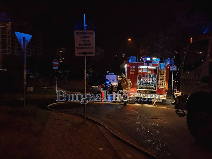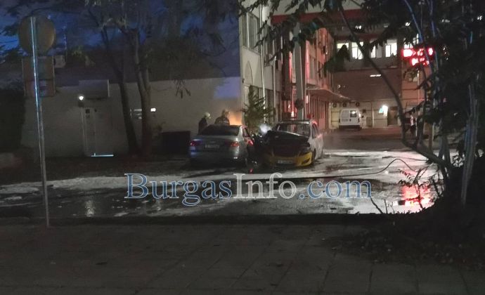 Сигналът е получен в 17.42 ч. тази вечер в Пето РУ Бургас. От току-що паркирало такси възникнало запалване, вероятно поради късо съединение в ел. инсталацията, като огънят се прехвърлил върху съседен автомобил.