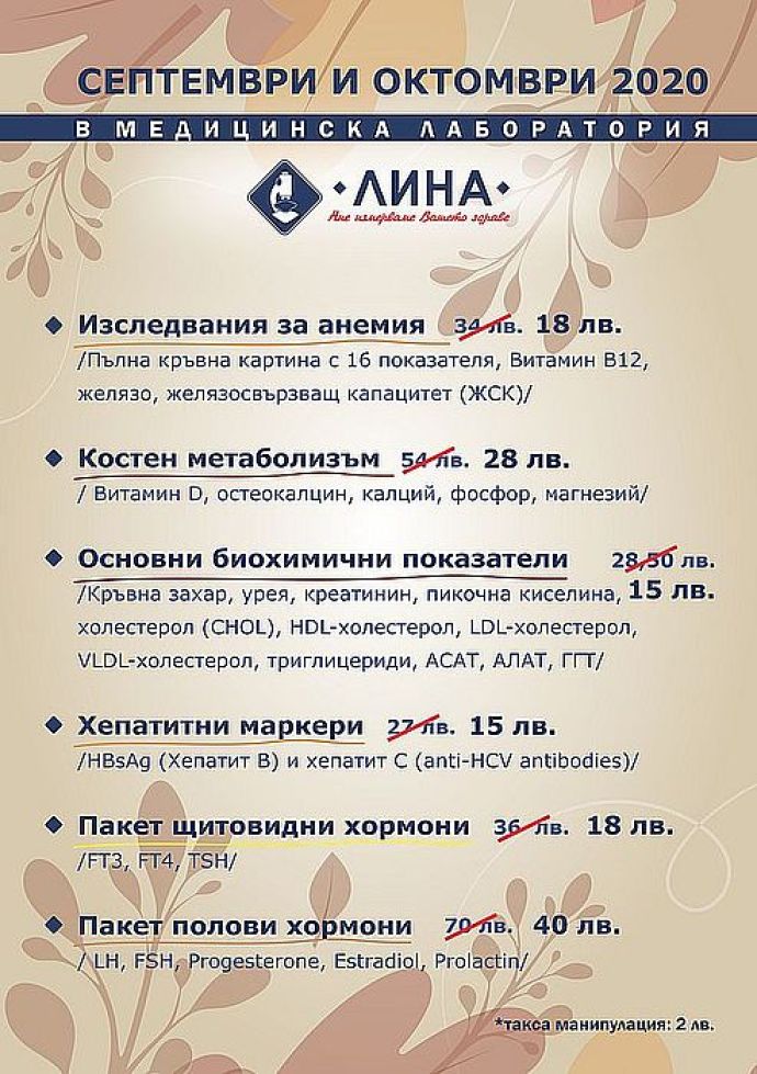 На прага на есента от медицинска лаборатория „ЛИНА” обявяват шест профилактични кампании с изследвания на преференциални цени, които са подходящи за различните членове на семейството. Кампаниите важат през месеците септември и октомври 2020 г. и се извършват в самостоятелните филиали на „ЛИНА” в областите Бургас, Варна, Сливен и Ямбол. За тях направление от лекар или предварително записване на час не са необходими. Таксата манипулация е 2 лв.