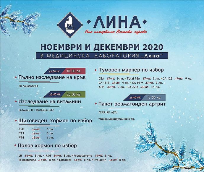 Медицинска лаборатория „ЛИНА” обявява шест профилактични кампании с изследвания на преференциални цени през месеците ноември и декември 2020 г. Те важат в самостоятелните филиали на „ЛИНА” в областите Бургас, Варна, Ямбол и Сливен, като направление от лекар или предварително записване на час не са необходими. Таксата манипулация е 2 лв.