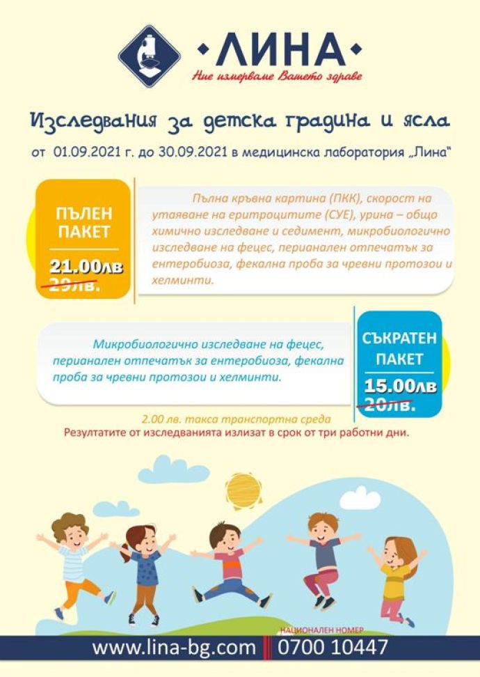 В помощ на родителите, от 1-ви до 30-и септември 2021 г., лаборатория „ЛИНА” предлага изследванията за постъпване в детска градина и ясла на преференциални цени.