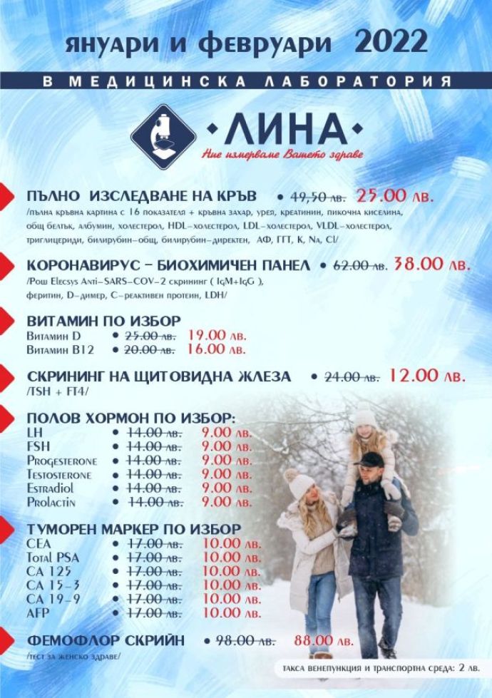 Медицинска лаборатория „ЛИНА” дава старт на 2022 г. с мащабна профилактична кампания, чиято цел е да насърчи пациентите да обърнат по-голямо внимание на здравето си. В нея са включени различни пакети с изследвания на преференциални цени, които важат през месеците януари и февруари в самостоятелните филиали на „ЛИНА” в областите: Бургас, Варна, Сливен и Ямбол. За тях не се изисква предварително записване на час или направление от лекар. Таксата венепункция и транспортна среда е 2 лв.