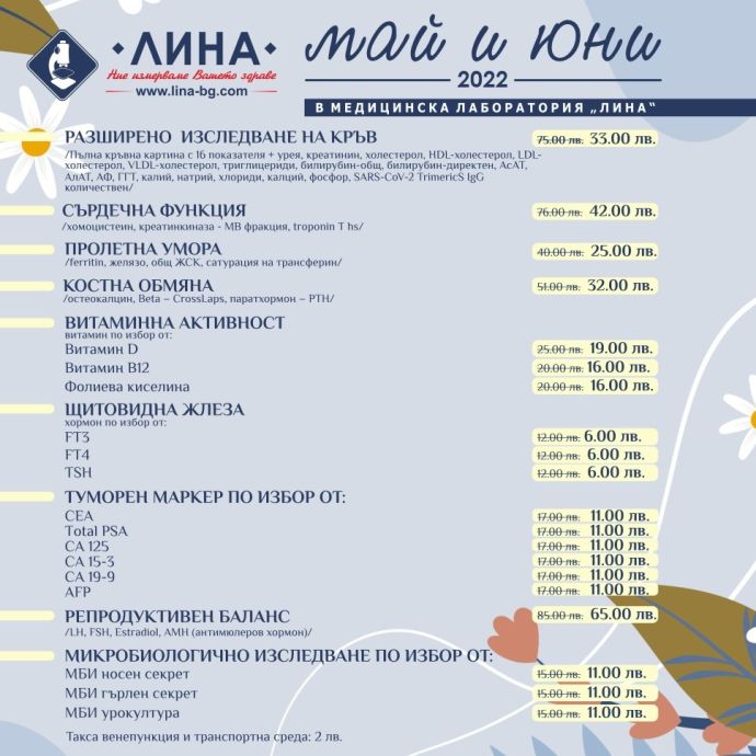 И през месец юни от лаборатория „ЛИНА” предлагат 9 профилактични пакета с изследвания на намалени цени. Те се извършват в самостоятелните ѝ филиали в страната, като за тях НЕ е необходимо записване на час или направление от лекар. Таксата венепункция и транспортна среда е 2 лв.