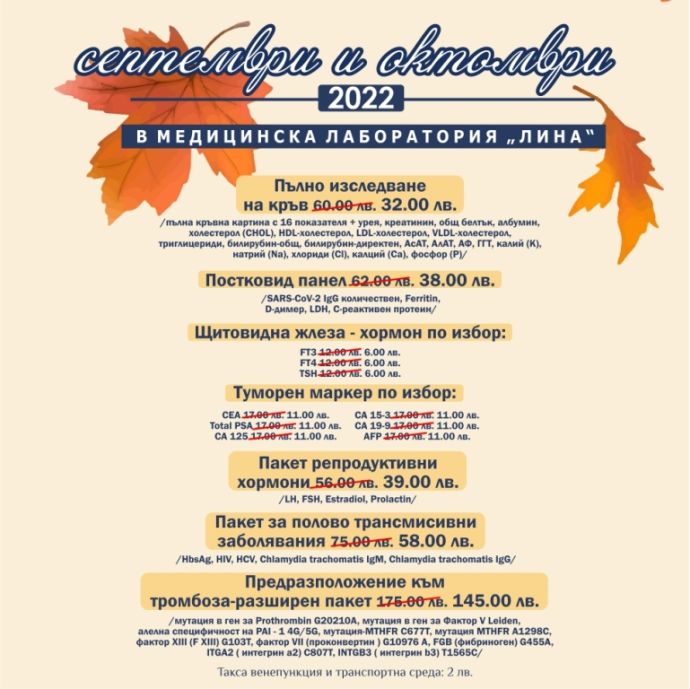 Профилактичните кампании на медицинска лаборатория „ЛИНА” продължават и през месец октомври. Те важат в самостоятелните ѝ филиали в областите: Бургас, Варна, Пловдив, Стара Загора, Сливен и Ямбол, като за тях предварително записване или направление от лекар НЕ са необходими. Таксата венепункция и транспортна среда е 2 лв.