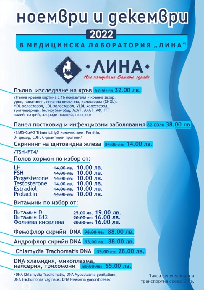 Медицинска лаборатория „ЛИНА” е първата в страната, която въведе месечни профилактични кампании с грижа за пациента. Те важат във всеки от самостоятелните ѝ филиали. Таксата венепункция и транспортна среда е 2 лв.