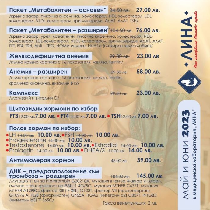 И през месец юни медицинска лаборатория „ЛИНА” предлага голям брой изследвания на намалени цени. Част от показателите са по идея на пациентите, които гласуваха в онлайн анкетата на сайта на „ЛИНА”. Те посочиха като най-желани анализи: щитовидни хормони, HOMA индекс, TSH, гликиран хемоглобин и изследвания за анемия.