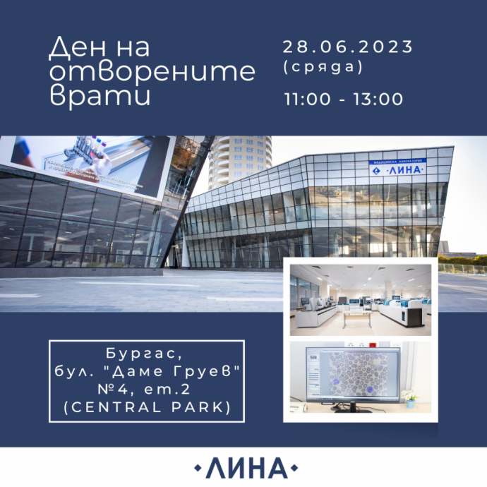Как протича работният процес в една от най-модерните медицински лаборатории в Европа, управлявана от изкуствен интелект? Вижте това лично, като се включите в Деня на отворените врати в централата на „ЛИНА” на 28 юни (сряда) от 11:00 ч. до 13:00 ч. Лабораторията се намира в Central park, срещу плувен басейн „Парк Арена ОЗК” в ж.к. „Славейков”.