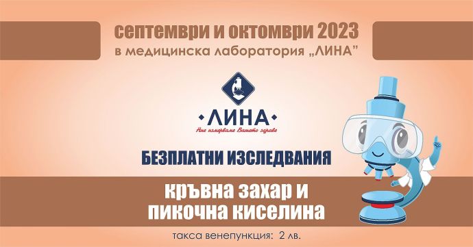 През месеците септември и октомври медицинска лаборатория "ЛИНА" показва своята грижа към здравето на пациентите, като предлага безплатни изследвания на кръвна захар и пикочна киселина. За желаещите да се включат в анализите има само стандартна такса венепункция от 2 лв. Инициативата има за цел да насърчи хората да обръщат по-голямо внимание на своето състояние.