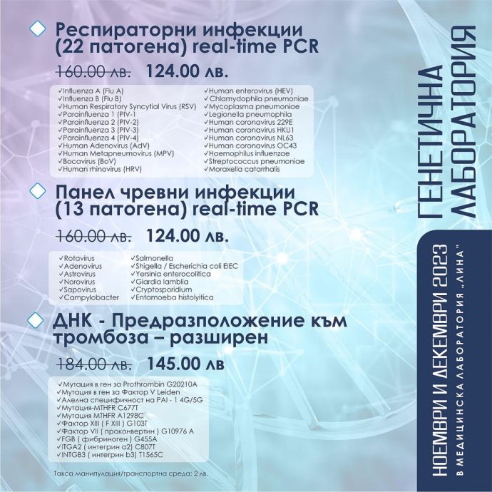 Тестове за респираторни инфекции, чревни инфекции и изследване за предразположение към тромбоза. Това са трите високоспециализирани анализа на намалени цени, които се извършват в „ЛИНА” през ноември и декември 2023 г. Здравното заведение от години има собствена генетична лаборатория с квалифицирани специалисти. А причината е, че молекулярните анализи позволяват по-голям обхват при откриване на определени патогени и мутации и едновременно с това са по-прецизни от стандартните тестове.![]()