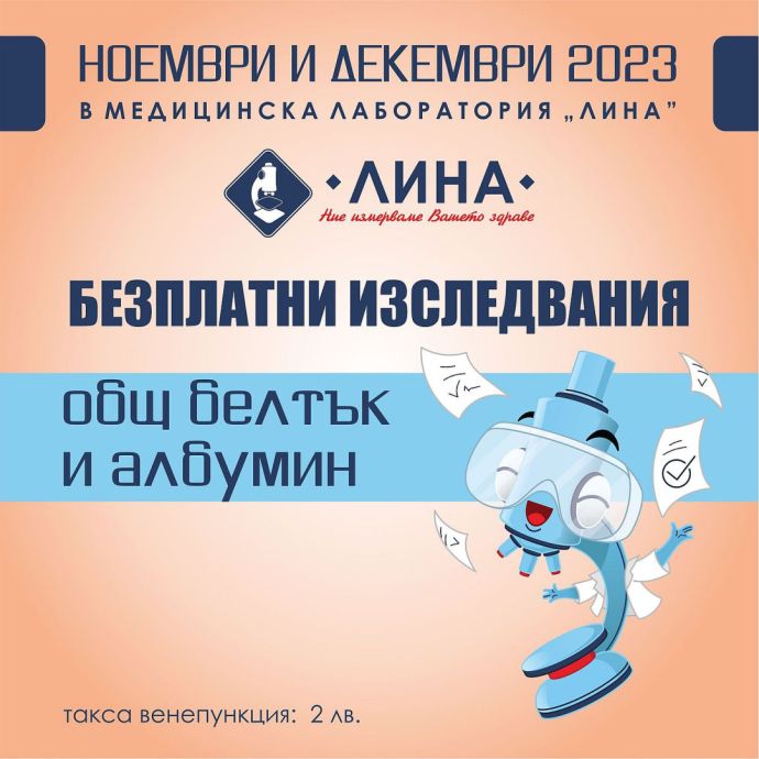 Медицинска лаборатория „ЛИНА” обявява новите си безплатни изследвания, които се извършват само срещу такса манипулация от 2 лв. До края на декември 2023 г. това са общ белтък и албумин. Анализите са достъпни за всички пациенти без значение дали са здравноосигурени или не. Те важат в самостоятелните лаборатории и манипулационни на „ЛИНА” в областите: Бургас, Варна, Пловдив, Пазарджик, Стара Загора, Сливен и Ямбол. Препоръчително е да се извършват сутрин на гладно.