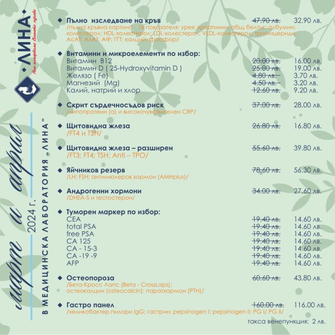 Медицинска лаборатория „ЛИНА“ е първата в страната, която въведе месечни профилактични кампании с грижа за пациента. Те важат във всеки от самостоятелните ѝ филиали. Такса венепункция: 2 лв.