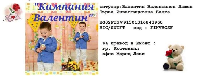 Директен превод по сметката на момчето може да се направи в Първа Инвестиционна Банка: Титуляр: Валентин Валентинов Зашев