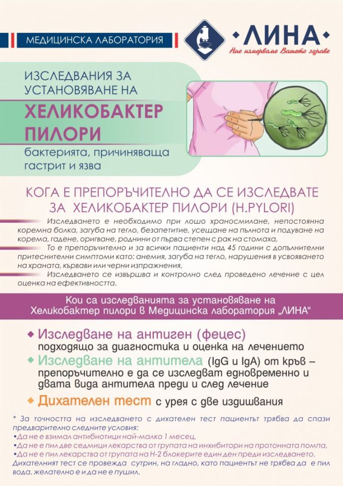 За откриване на Хеликобактер пилори в лабораторни условия, съществуват различни видове изследвания. Специалистите на лаборатория „ЛИНА” разкриват подробности за начина на извършване на всеки от тестовете и кога е подходящо да бъде извършен – за диагностициране на инфекцията или за проследяване на ефективността на лечението.