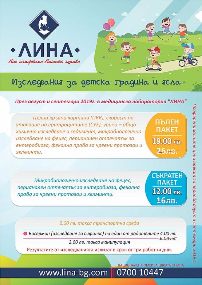 До края на месец септември 2019г. медицинска лаборатория „ЛИНА” предлага изследванията, необходими за постъпване на малчуганите в детска градина или ясла, на преференциални цени.