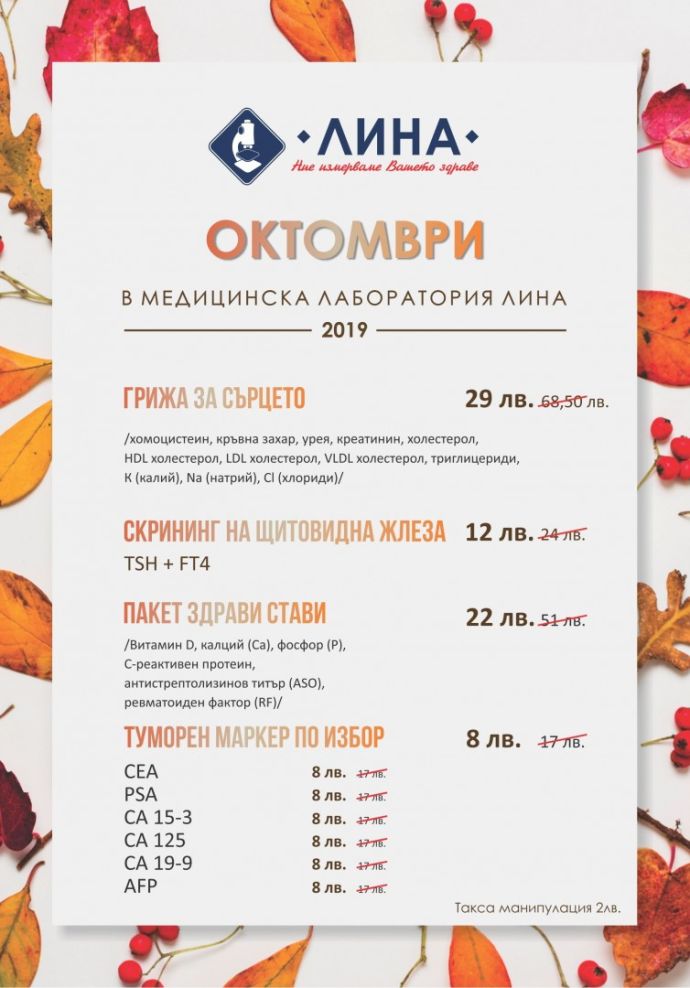 Четирите профилактични кампании на медицинска лаборатория „ЛИНА”: грижа за сърцето, скрининг на щитовидна жлеза, туморен маркер по избор и пакет здрави стави продължават до края на месец октомври. Пациентите могат да изберат една или да комбинират няколко, като предварително записване или направление от лекар не се изискват. Кампаниите важат в самостоятелните филиали на лабораторията в областите Бургас, Варна и Ямбол. Таксата манипулация е 2лв.