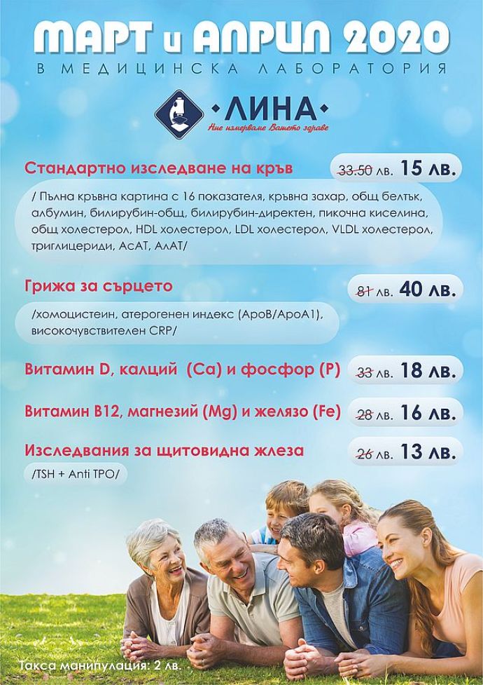 Месечните кампании на лаборатория „ЛИНА” важат в самостоятелните ѝ лаборатории в областите Бургас, Варна и Ямбол. Таксата манипулация е 2лв.