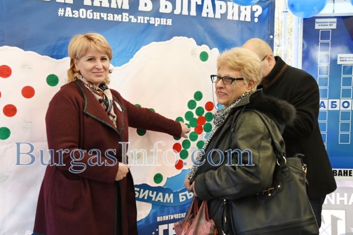 „Обичам България, защото тя е моята родина, тук са близките ми, красивата природа, морето. Това са само част от причините, поради които бургазлии обичат България, а пожеланията им изпълниха картата на страната ни, поставена в шатрата на ГЕРБ до Часовника в центъра на морския град днес.