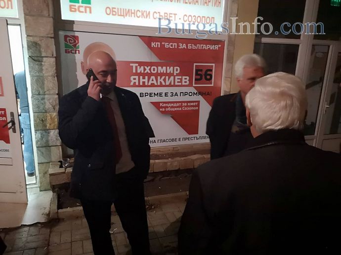 В щаба на кандидата за кмет на Созопол Тихомир Янакиев започнаха да пристигат първите резултати от балотажа в морската община. Самият Янакиев както и всички публични лица на БСП в Созопол са в офиса и трескаво следят цифрите. Първите от тях показват усилена преднина за Янакиев. В 6-та секция в Созопол гласовете за него са 310 срещу 82 за кандидата на ГЕРБ Красимира Германова.
