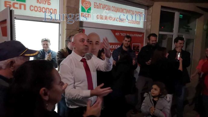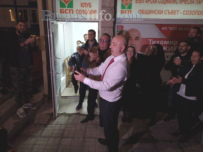 Кандидатът на БСП Тихомир Янакиев гръмна шампанското като победител на местните избори в община Созопол. Той спечели убедително пред кандидата на ГЕРБ Красимира Германова като преднината му е в почти всички секции както в селата, така и в морския град. В момента пред щаба на БСП цари еуфория. Социалистите спечелиха вота и в Черномроец, и в Атия.