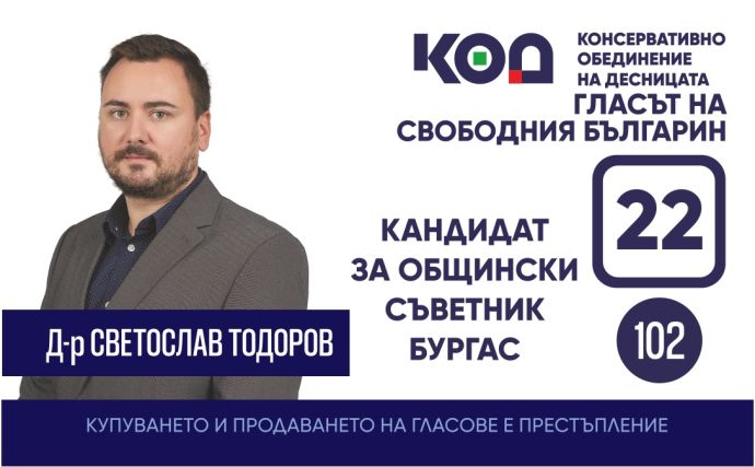 Д-р Светослав Тодоров е един от известните лекари в Бургас. 35-годишният специалист по неврохирургия е доказано име още от времето преди да стане зам.-управител на УМБАЛ Бургас, тъй като е бил мотор на не една здравна инициатива. Той е създател и на Facebook групата за взаимопомощ „Лекари и пациенти - Бургас”, която има близо 8 000 членове. На местните избори в морския град д-р Светослав Тодоров е на второ място в листата с кандидати за общински съветници на КОД Бургас. Той е представител на гражданската квота. За нашите читатели лекарят разкрива каква е мотивацията му да се впусне в предизборната надпревара.
