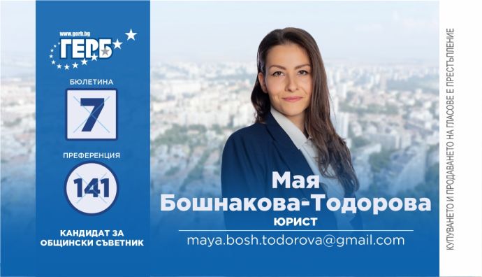 Можете да подкрепите Мая Бошнакова-Тодорова, като гласувате за ГЕРБ с №7 в интегралната бюлетина и отбележите преференция 141.