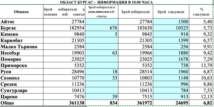 Районната избирателна комисия обяви каква е активността до 10 часа тази сутрин. До урните в област Бургас са отишли 6,82% от имащите право на глас, което прави 24 695 души. В град Бургас активността е 5,73%. Най-висока е в Приморско, където е 13,79%.