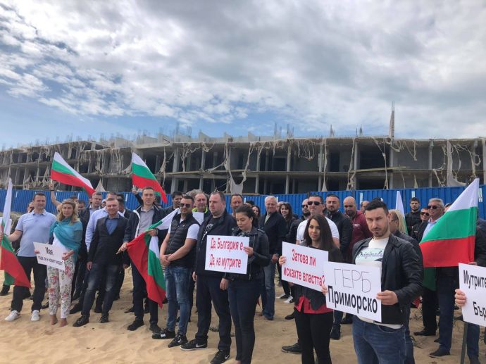 „Мая това ли е новата ти централа, от тук ли ще управляваш? Това ли е новият морал? Затова ли искате властта? Да, България е Да, на мутрите“, бяха част от плакатите, които издигнаха присъстващите около 80 души днес, сред които и младежки, както и жители на Приморско.