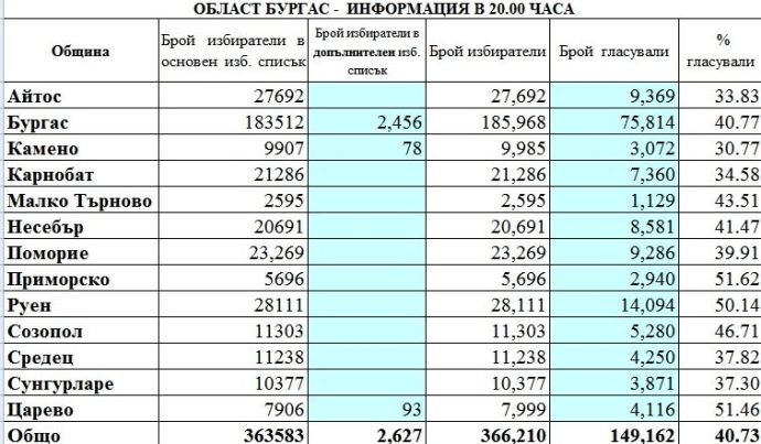 На извънредните парламентарни избори в разгара на лятото са гласували 40,73% от имащите право на глас жители на област Бургас, сочат обобщените данни на РИК.