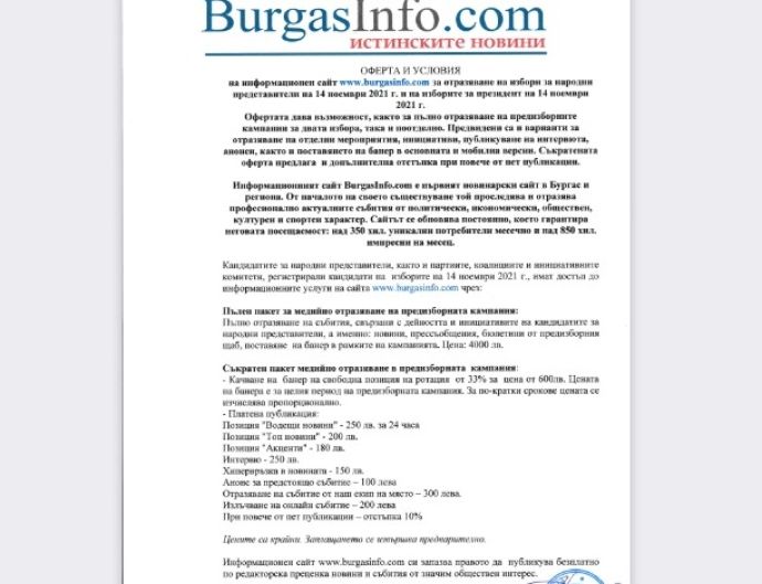 Информационният сайт www.burgasinfo.com е първият новинарски сайт в Бургас и региона. От началото на своето съществуване той проследява събитията от политически, икономически, обществен, културен и спортен характер.