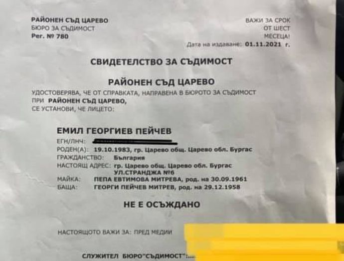 Обръщам се към вас, за да ви заявя, че никога не съм бил задържан от полицията. Не само през 2006 год, но никога преди това, никога и до днес. Това обяви публично, обръщайки се към жителите на Царево, опозиционерът Емил Пейчев, който е кандидат за депутат от „Продължаваме промяната“ в Бургаски регион за предстоящите избори. Повод за неговата реакция е замесването на името му в интрига по време на предизборната кампания, в която беше публикувана снимка от „криминалното“ му минало. Преди две седмици в сайт се появи новина, че той бил задържан за грабеж през 2006, която беше публично разпространена и от кмета на Царево Георги Лапчев в неговия профил във фейсбук. Още тогава Пейчев, както и бивш служител на МВР в Приморско реагираха, като обявиха, че това е лъжа, като той предприе редица стъпки, за да защити името си.
