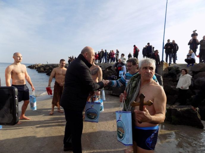Кметът на община Поморие Иван Алексиев награди за смелостта всички участници, скочили в студените води на януарското море.