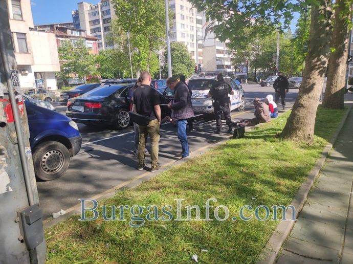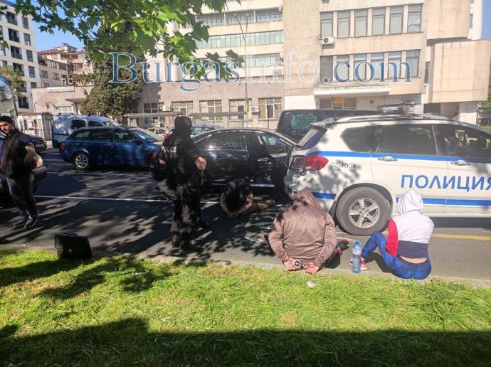 Към този час движението по бул. „Стефан Стамболов”, в посока центъра, точно срещу Новата поща, е затруднено. Двамата задържани са на тротоара и на пътното платно. Там е и колата им черно „Ауди А8”. На място са спец полицаи, както и криминалисти.