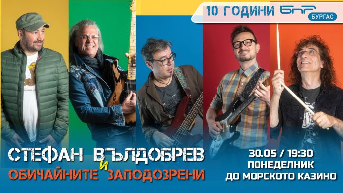 Лятото идва с БНР-Бургас, Стефан Вълдобрев и „Обичайните заподозрени“. Концерт на звездната формация на 30 май от 19.30 часа на терасата до Морското казино ще отбележи 10 години от създаването на радиото. С музикалното събитие обществената медия иска да благодари за доверието, което вече десетилетие ни оказват ежедневно жителите на Бургаска област, превръщайки ни в информационен лидер.