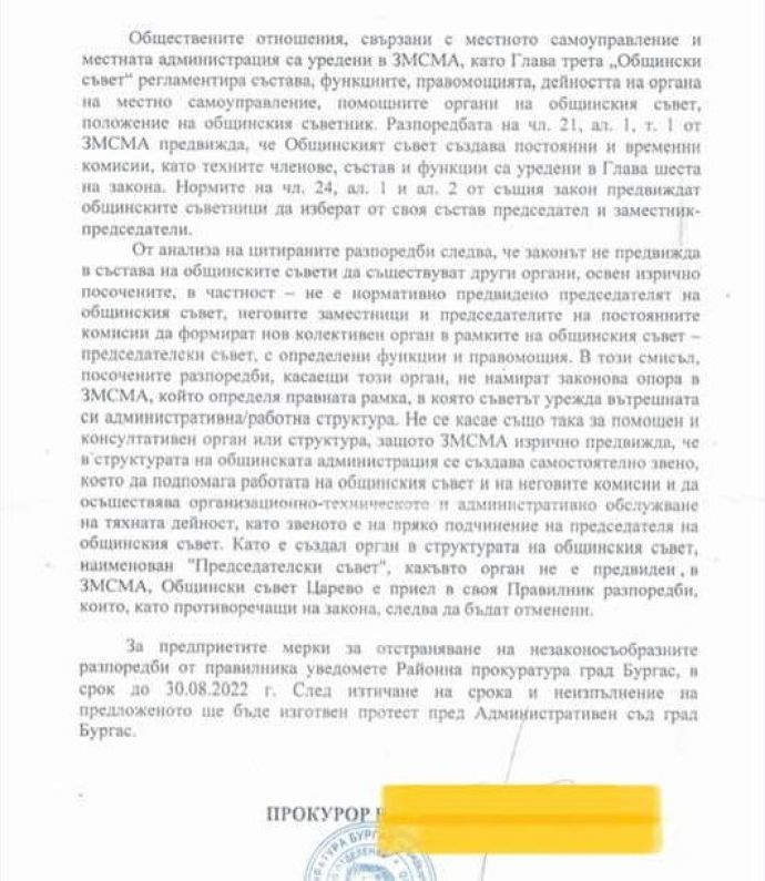 Препоръката на прокуратурата е Общински съвет в Царево да коригира Правилника до 30 август, защото в противен случай ще бъде направен протест пред Административният съд и на Общината ще бъде наложена глоба.