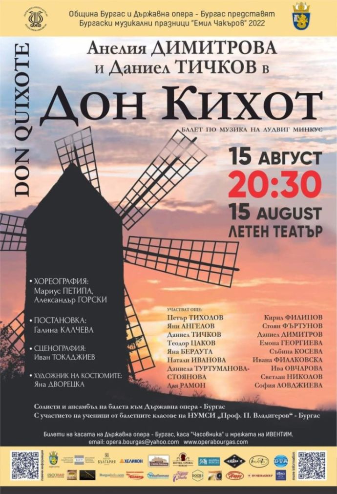 Почитателите на изящното балетно изкуство ще имат възможност да се насладят отново на една от най-мащабните балетни постановки – „Дон Кихот“ по музика на Лудвиг Минкус – на 15-и август, понеделник, от 20.30 часа на сцената на Летен театър – Бургас. Спектакълът е поредният от календара на Бургаските музикални празници „Емил Чакъров“ 2022, реализирани от Държавна опера – Бургас, с партньорството на Община Бургас.
