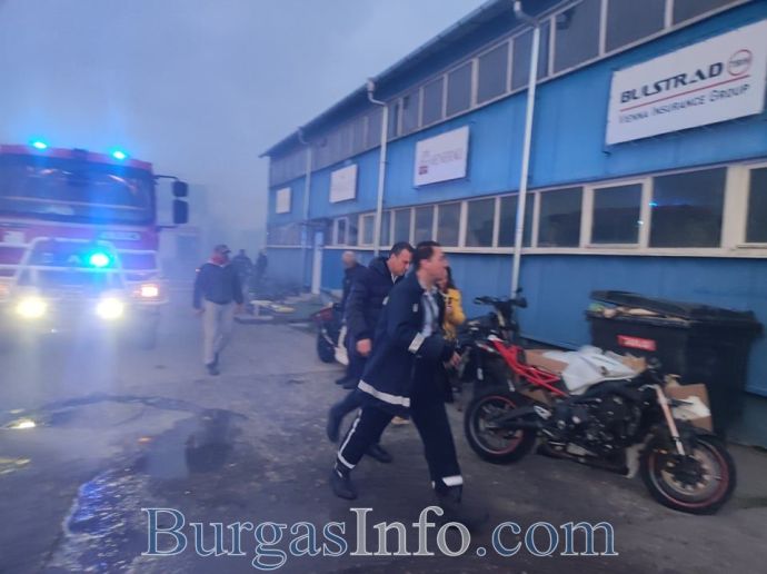Работници от халетата на автосервиз „Карашев”, който гори на ул. „Крайезерна” в Бургас, са излезли веднага, след като са чули гърмежи и всичко наоколо е било обвито в гъсти пушеци.