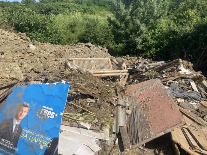 На нерегламентираното сметище са изхвърлили дори и двете табели от офиса на ПП.ГЕРБ- гр. Ахтопол, които някога бяха монтирани на входа му!