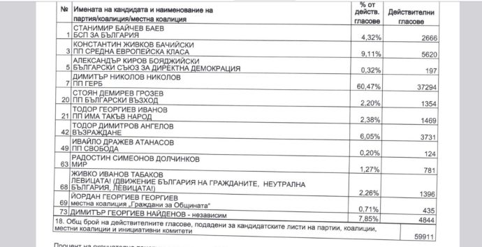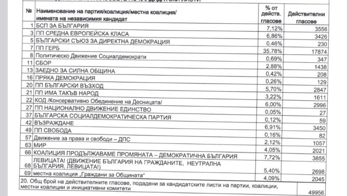 Листата на ГЕРБ е събрала 35,78% подкрепа, "Продължаваме промяната-Демократична България" - 7,725, БСП - 7,12%.