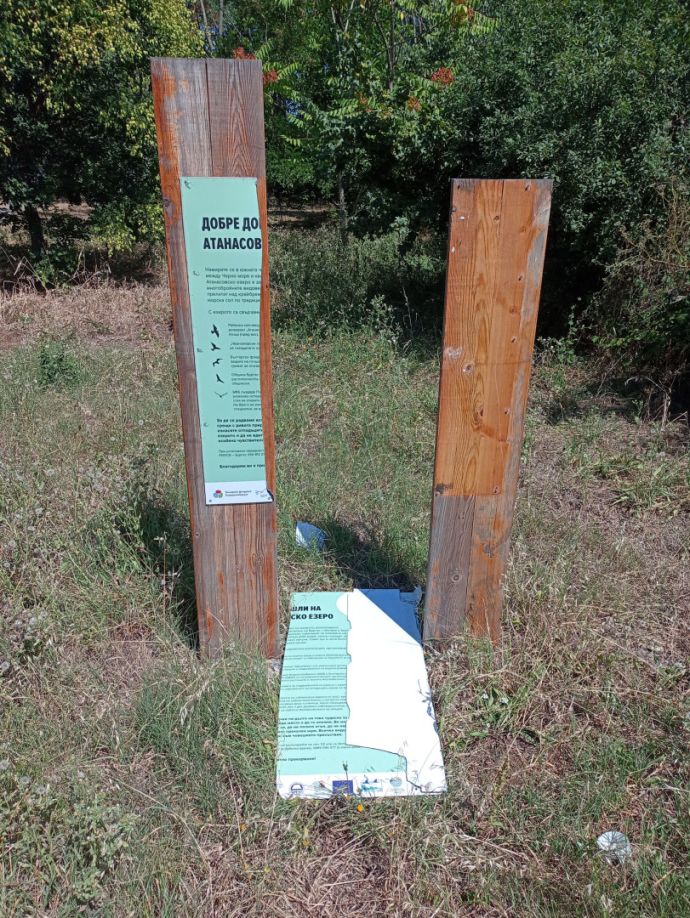 Бяхме неприятно изненадани от поредната вандалска проява и безсмислено унищожаване на една от последно поставените големи табели на Пътеката на саблеклюна. Тя представяше възможностите на района, отговорностите на различните заинтересовани страни и беше изработена и монтирана през 2023 г. от приятели на езерото, работещи в близкия офис на Пежо в Бургас (ЕС ЕФ ЕЙ РИТЕЙЛ). Вижда се, че табелата е жестоко ритана, за да се натроши информационния носител на парчета. А през април за Деня на земята беше поредната акция за подмяна на счупени табели по Пътеката.“, разказва Диана Павлова от Българска фондация Биоразнообразие (БФБ), която открива вандалската проява в Бургас в събота.