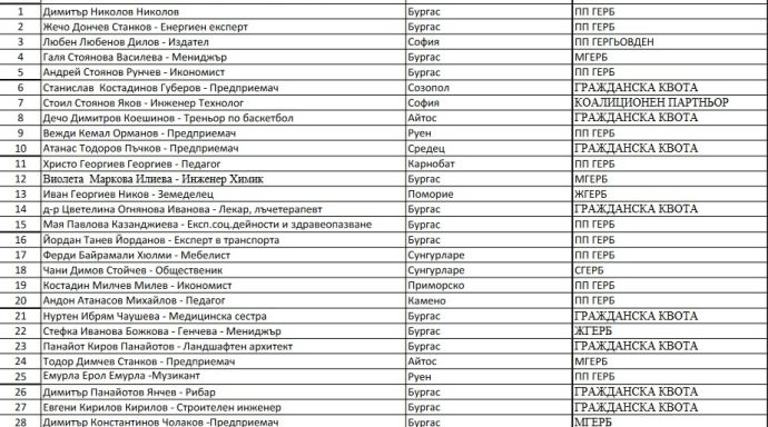 Водачът е кметът на Бургас Димитър Николов, втори е добре познатият в Бургас енергиен експерт Жечо Станков, на трета позиция е Любен Дилов, четвърта е Галя Василева, а пети – Андрей Рунчев.